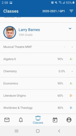 Grades per class/subject can be displayed in both percentages and letter grade.